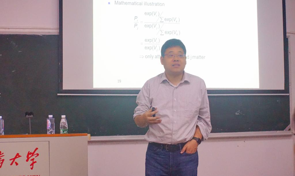 刘强副教授首先介绍了R软件,指出这是一套完备的数据处理、计算和制图软件系统。这套软件让使用者能够灵活机动地进行数据分析,甚至创造出符合需要的、新的计算方法。随后,他提出了对离散选择模型的三种分类方法:第一类是根据随机误差项的分布假设而分的Logit和Probit两种模型;第二类是根据因变量Y的取值水平而分的二元、多元模型;第三类是Mixed Logit等扩展模型。当谈及离散选择模型的作用时,他指出三点:能识别关键影响因素、能衡量关键影响因素的作用及能预测选择的概念结果。同时,刘强特别提醒在座师生,进行模型研究不仅仅观察数字变化趋势,更重要的是理解数字背后的机理,因此,希望在座师生多学习一些模型运算。