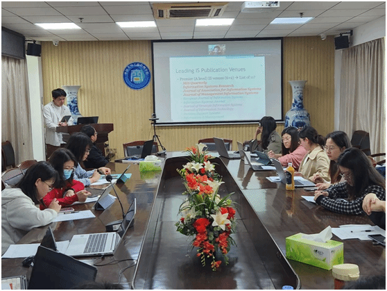讲座伊始,罗欣教授与师生们共同探讨了当前较为流行的几个学术热点话题,例如Artificial Intelligence and Human Collaboration等。他从编辑的视角,为在场的师生们推荐许多高质量的权威期刊,向大家介绍如何成功投稿优质期刊及其过程中的注意事项。罗教授建议大家可以先将论文摘要发送给期刊编委会,请编委判断论文是否适合在该期刊投稿,并叮嘱同学们在与编委交流的过程中一定要注意礼节,充分运用语言的艺术。