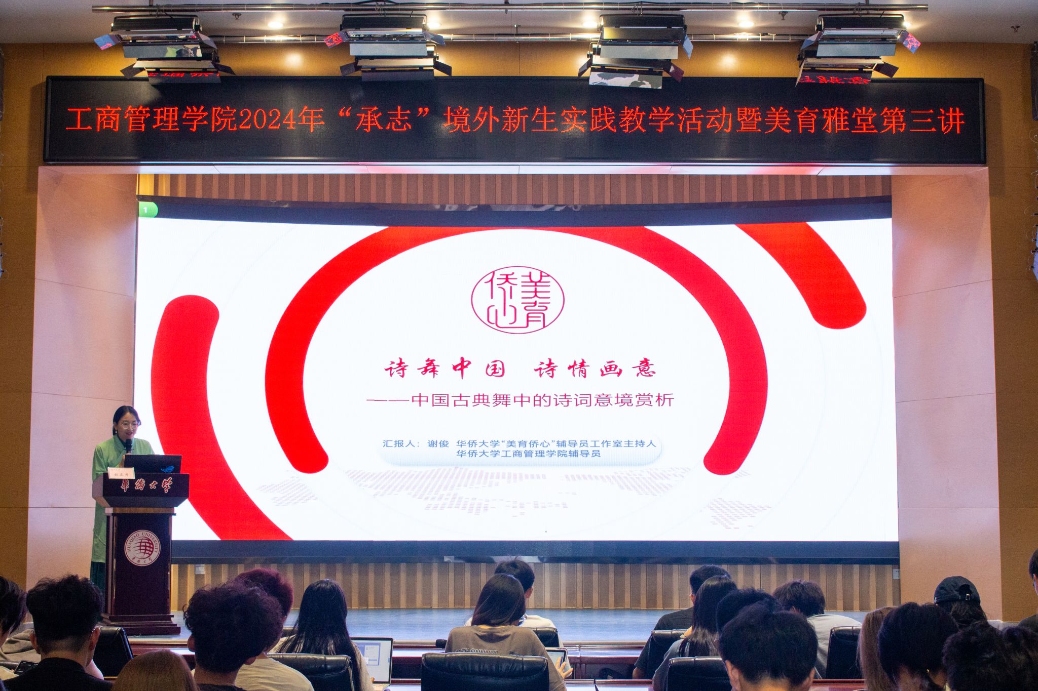 在校内,学院举办美育雅堂,“美育侨心”辅导员工作室主持人谢俊老师作题为《诗舞中国 诗情画意——中国古典舞作品的诗词意境赏析》主旨报告,通过舞蹈艺术的展示与讲解,让同学们领略了中国古典诗词的意境之美。讲座现场,提线木偶非遗传承人庄文铁老师为同学们带来《青春梦》精彩表演和讲解,展现了中华文化的博大精深。