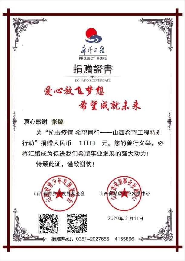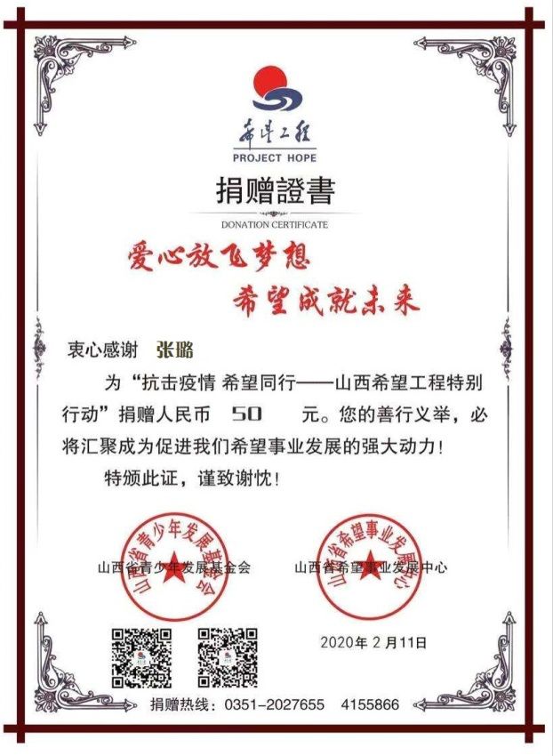 随着疫情的发展,全国各地的医护人员驰援武汉,社会各界纷纷捐款捐物,这一切深深地打动了张璐。她先后两次将自己微信账户上仅有的150元通过山西希望工程捐助给了疫情严重的地区。