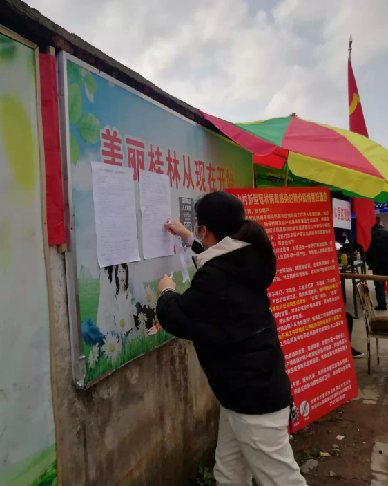 除了参加疫情排查工作外,她还参加了桂林市七星区穿山乡村组路口值守工作。工作内容主要包括:在管控关卡处进行外来务工者进出登记并发放出入证、测量体温和张贴相关通告,协助村委开展进出人员管控工作。