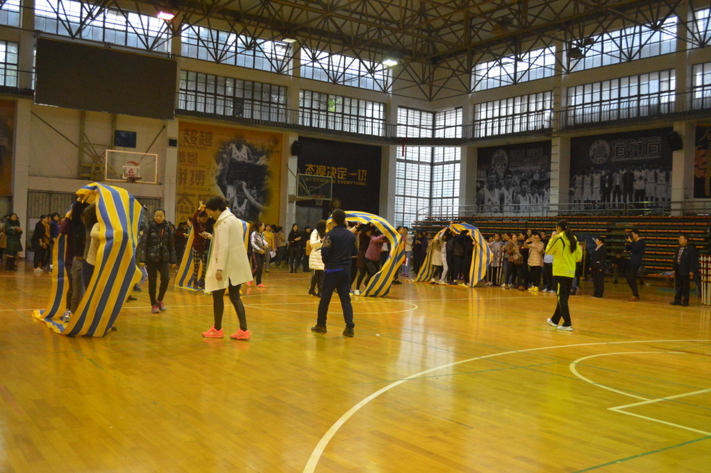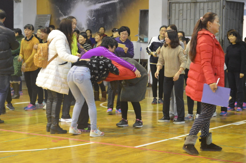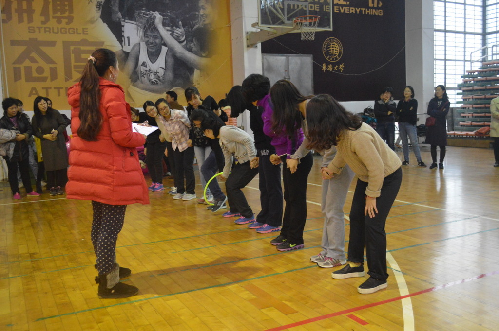 图为“呼啦圈过山车”。我院女教职工们手拉手用灵活的肢体动作传递着不可落地的呼啦圈。