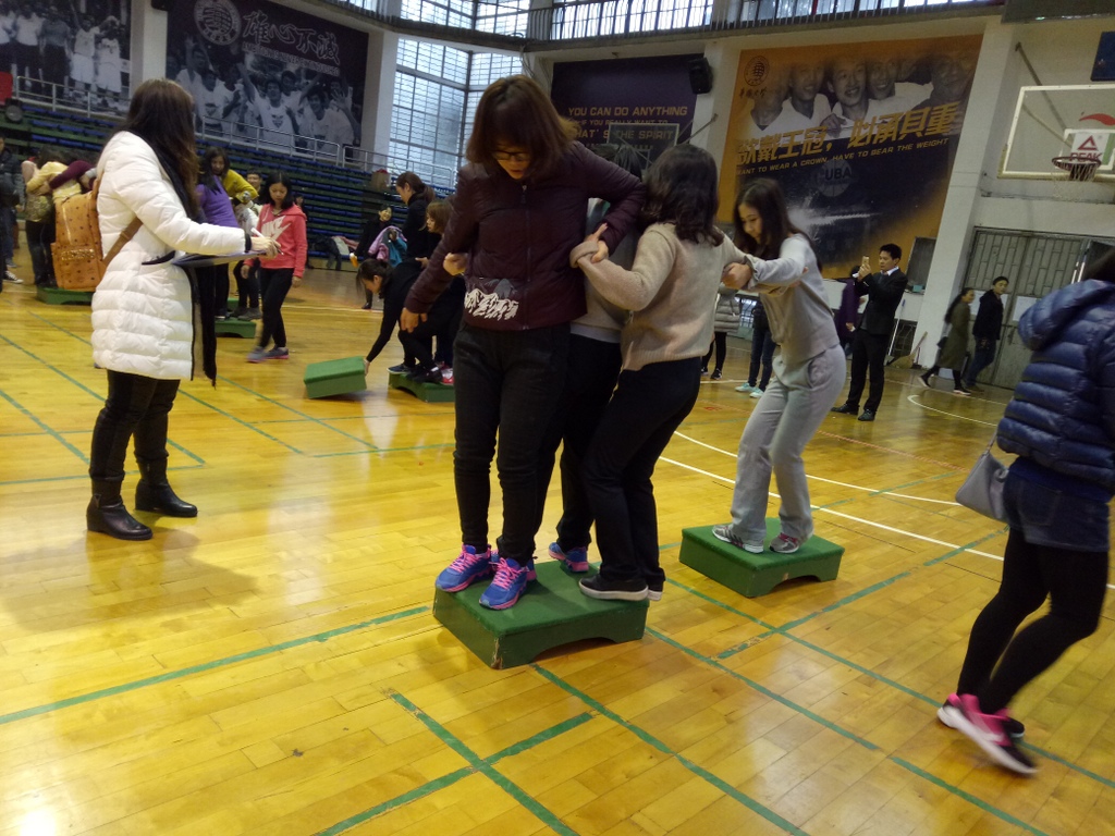 图为“同舟共济”。女教职工四人一组相互合作,在“不落水”前提下移动脚下的“舟”驶向终点。