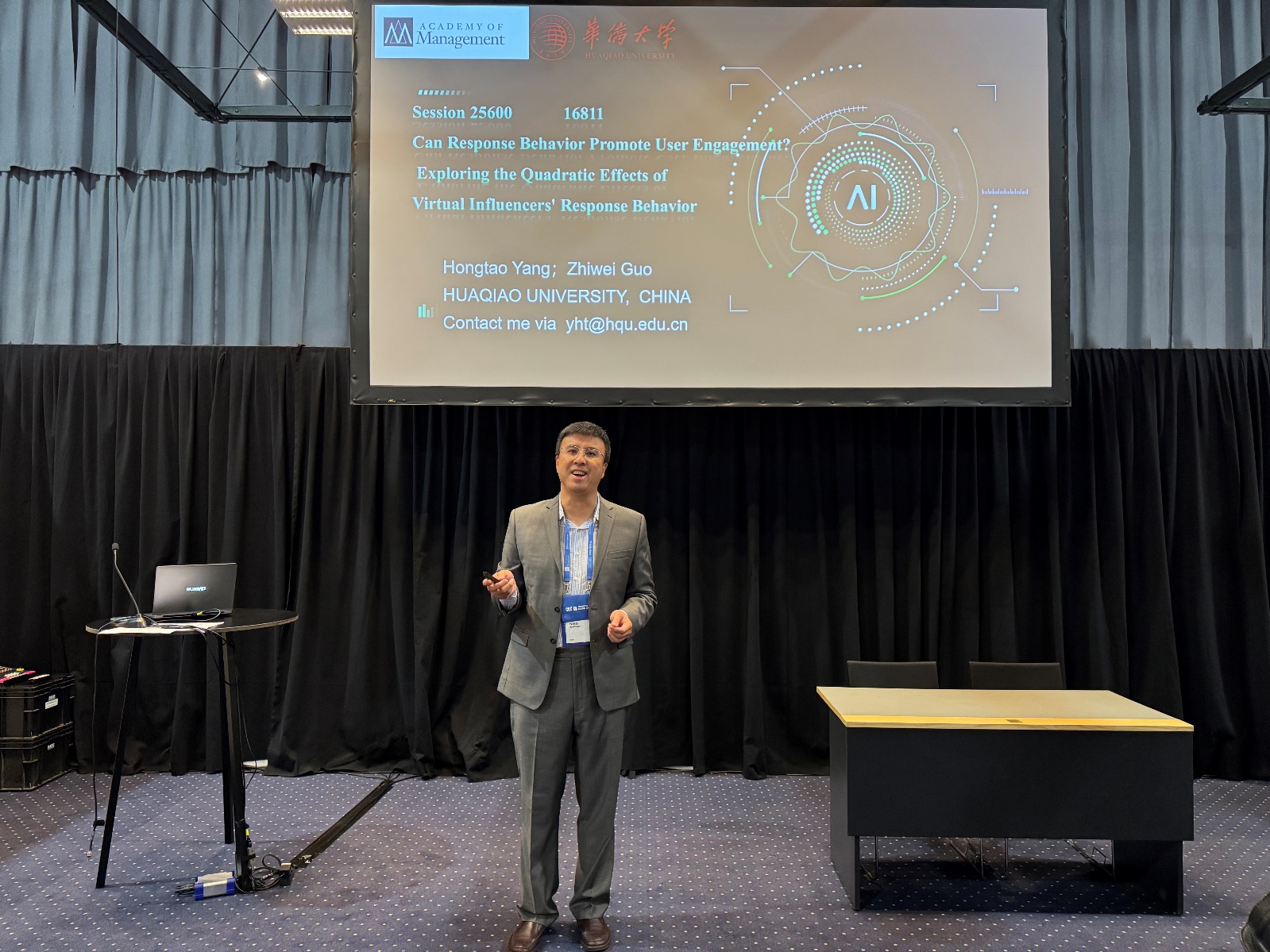 杨洪涛教授在会议上汇报了题为Can Response Behavior Promote User Engagement? Exploring the Quadratic Effects of Virtual Influencer的论文,聚焦于虚拟社交时代的用户参与机制,探讨了回应行为与用户黏性之间的非线性关系,为数字平台用户行为研究提供了新视角。