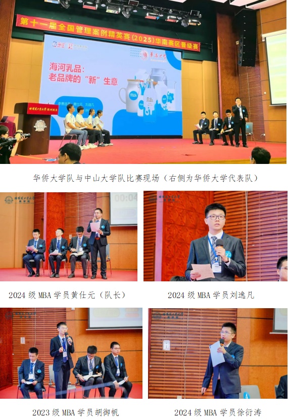 2025年9月14日,第十一届全国管理案例精英赛华南赛区晋级赛在哈尔滨工业大学(深圳校区)举办。中山大学、哈尔滨工业大学、华南理工大学、福州大学等13所院校14支队伍参赛。经过激烈角逐,华侨大学MBA学生代表队获得了团队“季军队”、个人“最佳风采奖(黄仕元同学)”。
