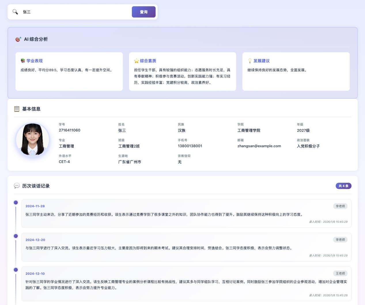 令他惊喜的是,见面时与裴老师的交流如此的顺畅与深入。这得益于“数智平台”构建的学生全周期成长数据系统。该系统可以结合学业、竞赛、实践等多维信息,生成一份客观的“学生成长画像”,这为裴老师与学生的谈心谈话提供了客观的大数据支撑。在此基础上,裴老师根据自身的专业洞察与人文关怀,为柯同学厘清了专业课程之间的逻辑关系,并针对其兴趣推荐了相关竞赛与实习方向。“老师的解答都特别有针对性”,柯同学感慨,“交流之后,我对接下来该参与哪些实践、重点修读什么课程,一下子清晰了起来。”