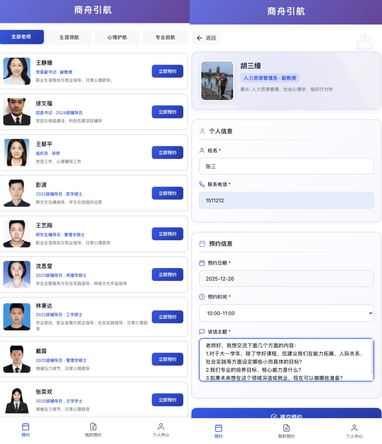 针对学业压力、人际困扰与未来规划等日益多元的学生心理议题,平台与学院心理辅导站深度协同,正式开通“心理护航”通道。该辅导站是学院积极响应学校首批二级心理工作站建设要求设立的专业支持单元。院领导、专业教师、系主任、辅导员等老师已入驻平台,学生可以一键预约,轻松获得个性化指导与支持。