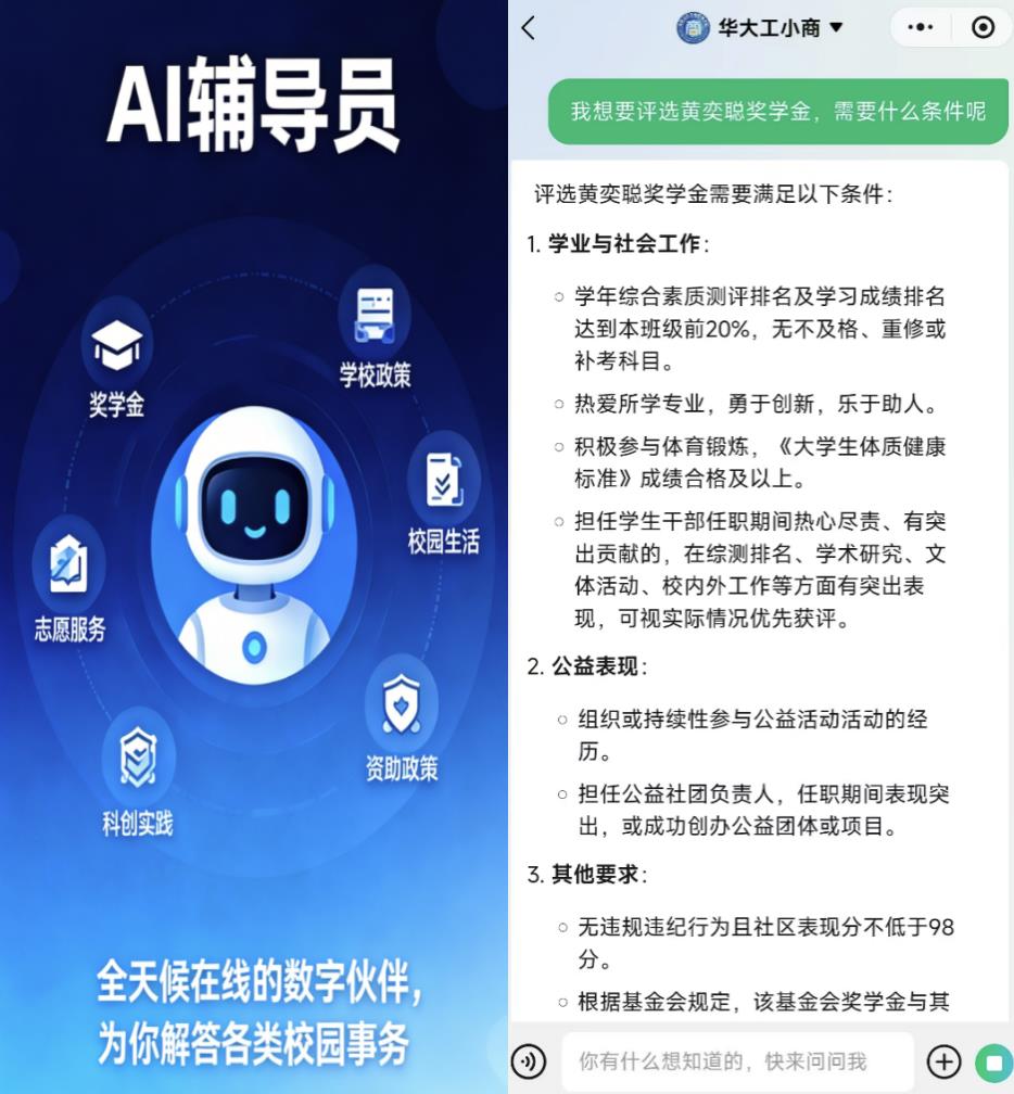 如今,他已习惯打开“数智赋能”平台中的“AI辅导员”页面。这位全天候在线的数字伙伴,不仅能解答奖学金评选相关疑问,还可即时回应涉及校园生活、资助政策、科创实践、志愿服务等各类常见事务。输入“国家奖学金申请条件”等问题,系统即刻推送相关文件全文与关键条款解读。在“AI辅导员”的协助下,黄同学不仅成功申获一项专业奖学金,也更明确了后续该在哪些方面持续努力。“信息透明了,奋斗的方向也就更清晰了。”他表示。