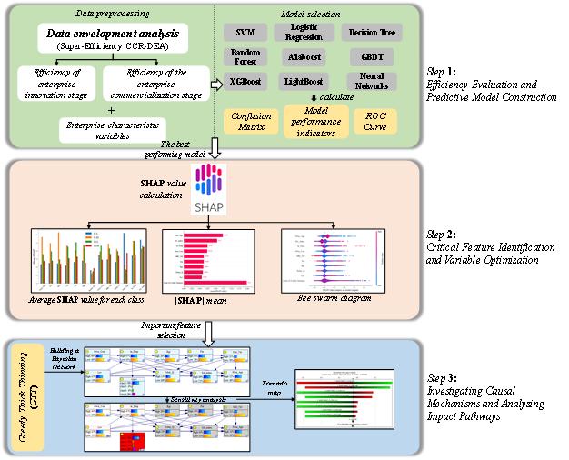 成果鉴于多阶段流程所固有的复杂性,提升企业效率一直是管理学研究领域的一项重大挑战。研究基于2009年至2023年间的29,602个企业样本数据,运用超效率数据包络分析方法,将企业效率分解为创新阶段与商业化阶段进行考察。分析结果识别出四种不同的效率聚类,其中仅有27.667%的企业在这两个阶段均实现了高绩效表现。随后,研究利用九种机器学习算法构建预测模型;结果显示,XGBoost算法表现最优,对企业效率聚类的预测准确率达到72.520%。SHAP分析揭示,企业成立年限、融资约束以及第一大股东持股比例是预测企业效率最关键的因素。此外,贝叶斯网络分析揭示了影响企业创新效率的两条关键传导路径,即:第一大股东持股比例→员工规模→企业效率;以及资产负债率→员工规模→企业效率。研究表明,单个变量的变化能够通过网络传导机制引发连锁效应,并最终对企业的整体效率产生影响。因此,政府部门与企业主体应依据实际的效率表现,采取差异化的策略,以有效推动企业效率的提升。