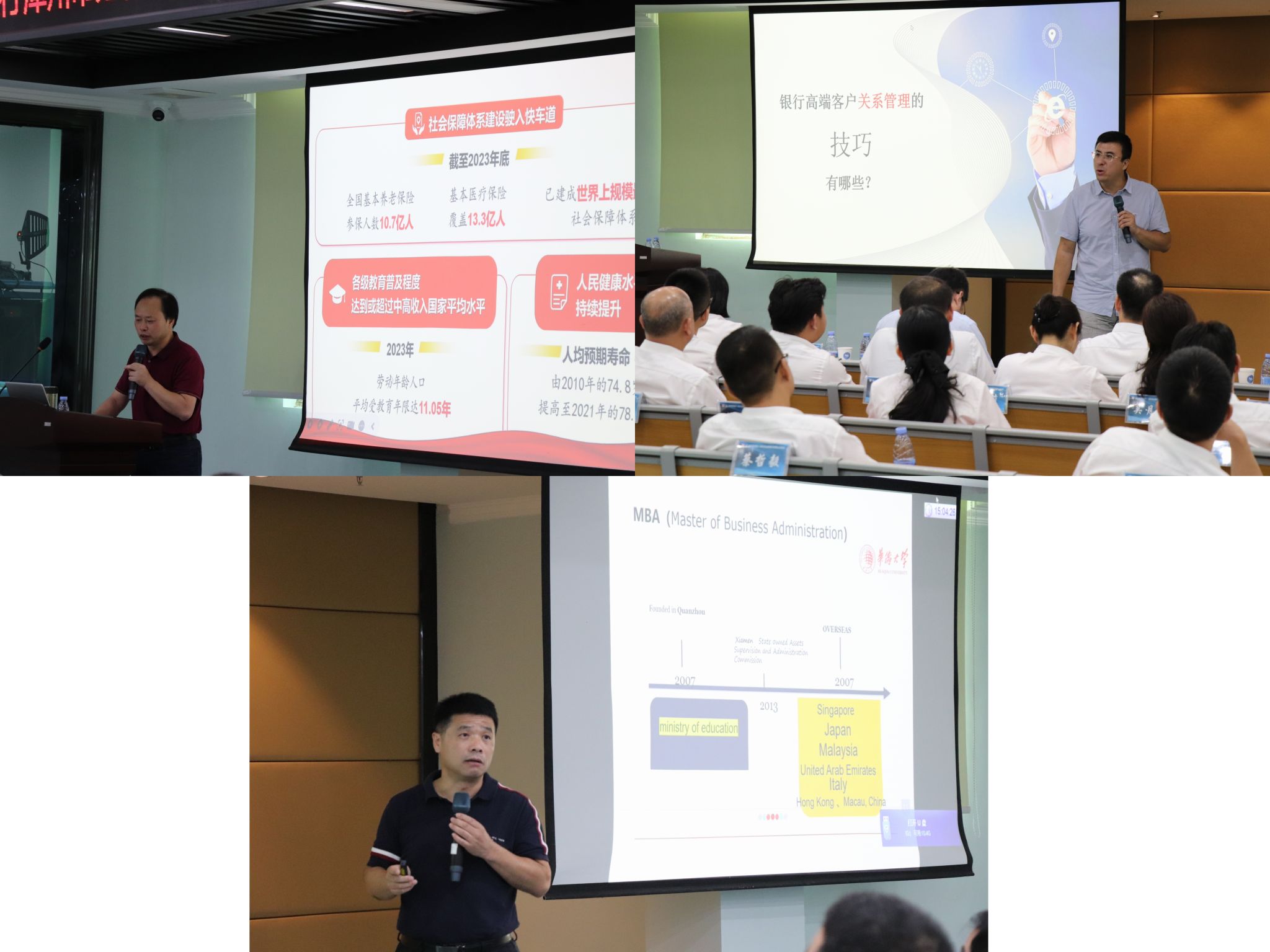 本次培训邀请了华侨大学马克思主义学院院长曹文宏教授、霍英东全国青年教师奖获得者杨洪涛教授、华侨大学工商管理学院院长衣长军教授、“福建省优秀教师”胡加生老师、华侨大学工商管理学院马占杰老师、李义斌老师等,围绕党的二十届三中全会精神解读、银行高端客户关系营销管理技巧、商业盈利模式、企业团队建设与文化、当前经济与金融形势及应对、领导力提升之道-卓越管理者的成功密码等内容进行授课。
