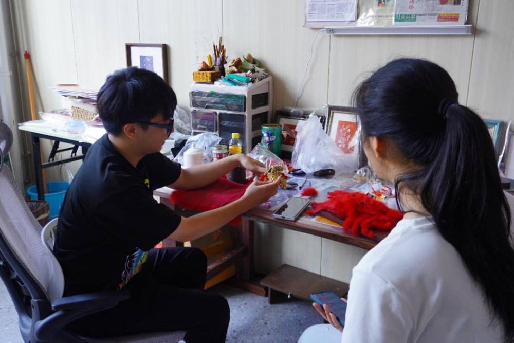 图3 泉州杨氏戏剧道具和李尧宝刻纸传承人杨佳烨向学生介绍工艺