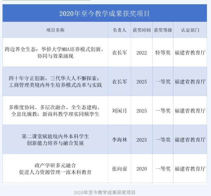 学院坚持将科研能力转化为教学改革与人才培养的实际成效,形成了多维度成果突破。近年来,学院先后获得福建省本科教学成果奖特等奖、一等奖、二等奖等多项省级荣誉,在案例教学、实践体系构建和数智化课程创新等方面形成可复制、可推广的模式。同时,学院获批国家级课程思政教学名师和教学团队一个,《市场营销》课程分别获省级、部级课程思政示范项目,《MBA会计学》课程获省级课程思政示范项目,将价值引领融入新商科课程体系之中,标志着学院在科研赋能教学质量提升与育人体系完善方面实现了高质量跃升。