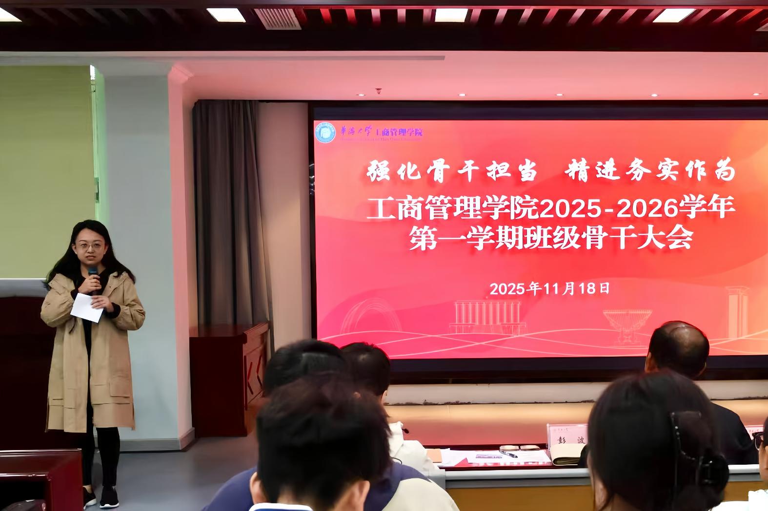 为加强班级建设,凝聚骨干力量,11月18日,工商管理学院在经管12楼多功能厅召开2025-2026学年第一学期班级骨干大会。学院党委副书记王静珊、团委书记徐文福、全体辅导员出席会议,本科生和研究生全体班级骨干参加。