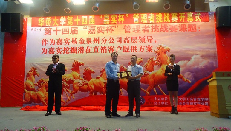 14时,由华侨大学工商管理学院承办,嘉实基金管理公司协办的第十四届“嘉实杯”管理者挑战赛开幕暨揭题仪式在明德堂顺利进行。此次比赛有来自九个学院共903名学生报名,共组建101支团队参赛,是管理者挑战赛开赛以来涵盖学院最广、报名人数最多的一届。参加开幕式的嘉宾有我院党支部总书记姚培生、嘉实基金福建分公司高级渠道经理夏雨、特邀讲师陈钦兰教授学院的其他相关领导和辅导员。