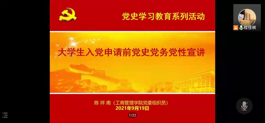 9月19日下午,工商管理学院党委举行了工商管理学院2021级新生线上入党宣讲会,本次宣讲会由陈祥南主讲,党建办优秀学生干部程佳祺主持,共329名2021级新生参加宣讲会。
