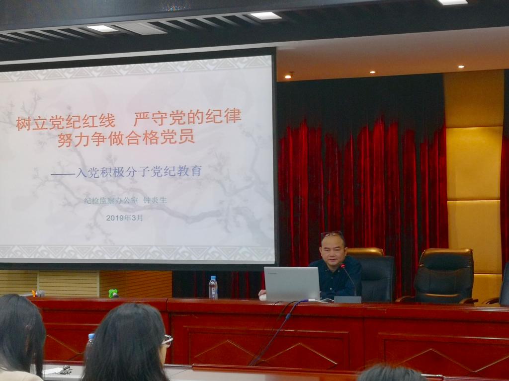 钟炎生以“树立党纪红线,严守党的纪律,努力争做合格党员”为主题,对入党积极分子做党纪教育的专题培训。他从政治纪律、组织纪律、廉洁纪律、群众纪律、工作纪律和生活纪律六个方面为同学们讲解,既有理论解读又有案例分析,让同学们对党的纪律有了基本认识。他还指出,作为入党积极分子,应当坚定理想信念,严格党性锻炼,形成高尚情操。