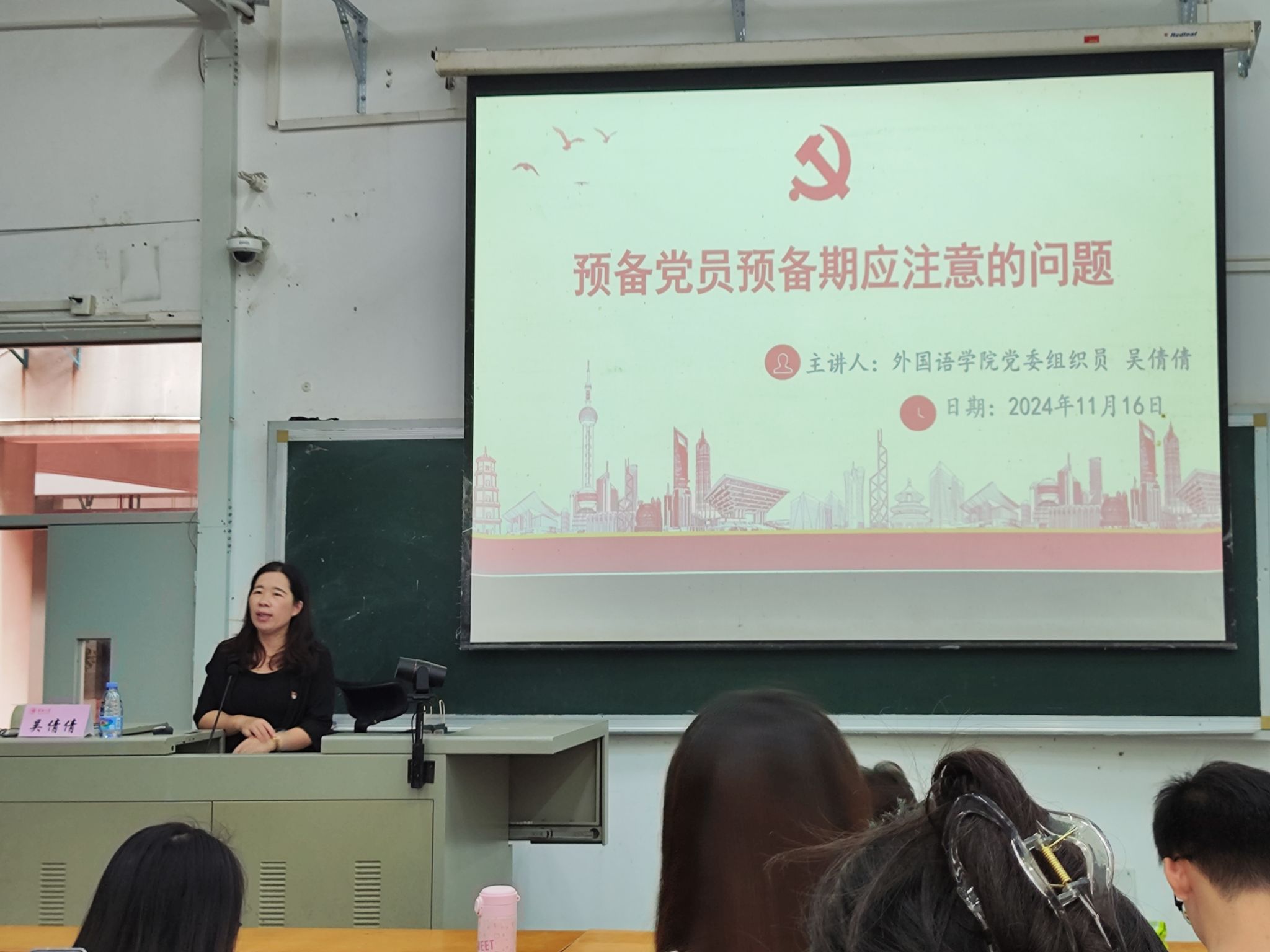 吴倩倩以“预备党员预备期的注意事项”为题,结合自身工作实际,从预备党员的预备期、预备党员应如何正确对待预备期、怎样写入党转正申请书、预备党员转的有关政策和规定、党组织关系有关问题解读、如何做好入党培养联系人六个方面介绍了预备党员预备期应注意的问题,强调预备党员要规范书写转正申请书和办理党组织关系转移手续,并希望预备党员能够以党员标准严格要求自己,在工作实践中经受锻炼和考验,努力完成党组织所分配的工作。